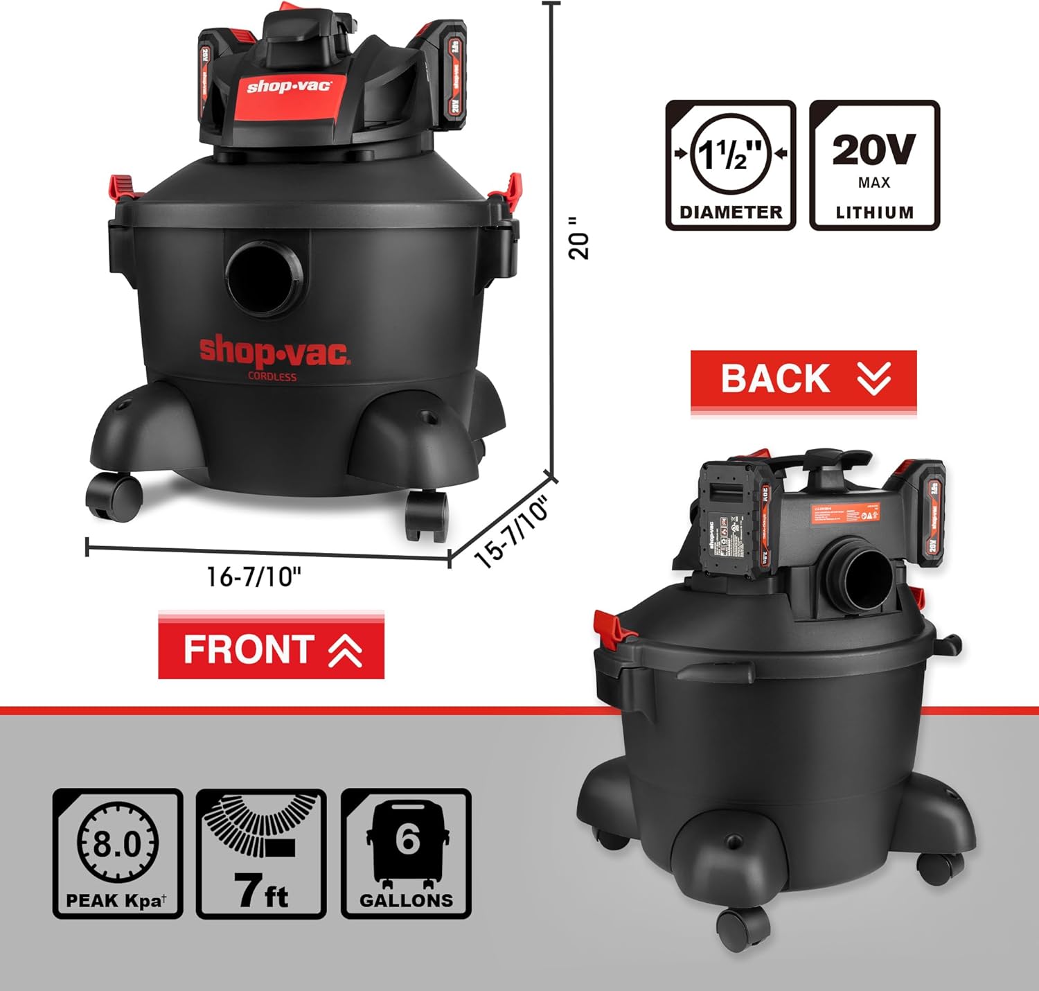 This cordless 20V shop vac comes with a large assortment of attachments and accessories. Rated at 8.0Kpa max of suction force, also includes 2 – 2Ah batteries and dual charger. This unit is filtered via standard cylindrical filter and also has a an extra layer of filtering with the provided filter bag. Has both Vacuum function as well as a Blower function. It uses the 1.5″ standard for hoses, etc. Easy to setup and use. Provides great suction for a cordless unit. 6 Gal capacity allows you to tackle most messes with ease, wet or dry. The onboard “storage system” is a bit ridiculous but, makes sense for storage only.
