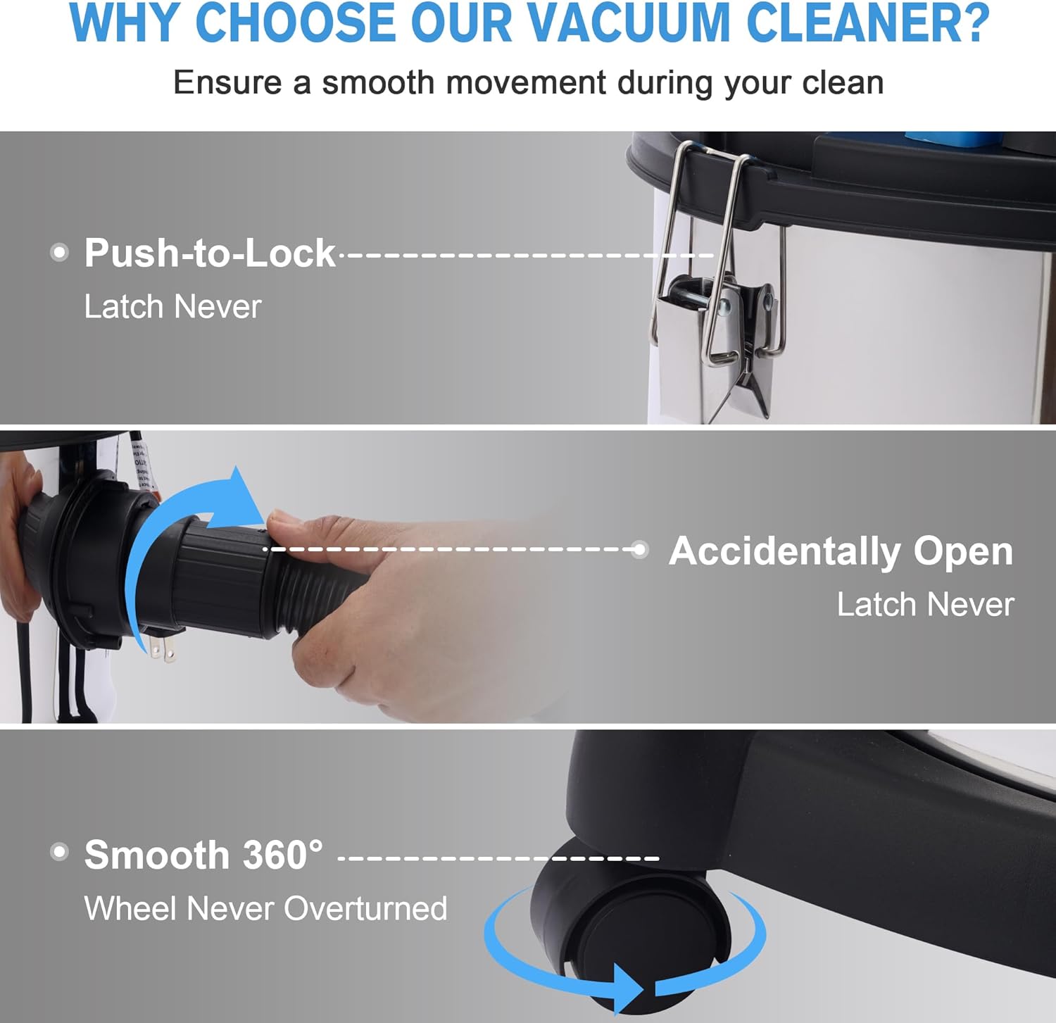 Versatile Vacuum 3 Modes- Our vacuum cleaner with 3 in 1 design is able to clean the dirt of different scenarios. Dry suction is designed for dust, debris, sand, sawdust, etc. Wet suction is for liquid spills. Besides, the blowing function can dislodge dust, dirt, debris and leaves from hard-to-reach areas.