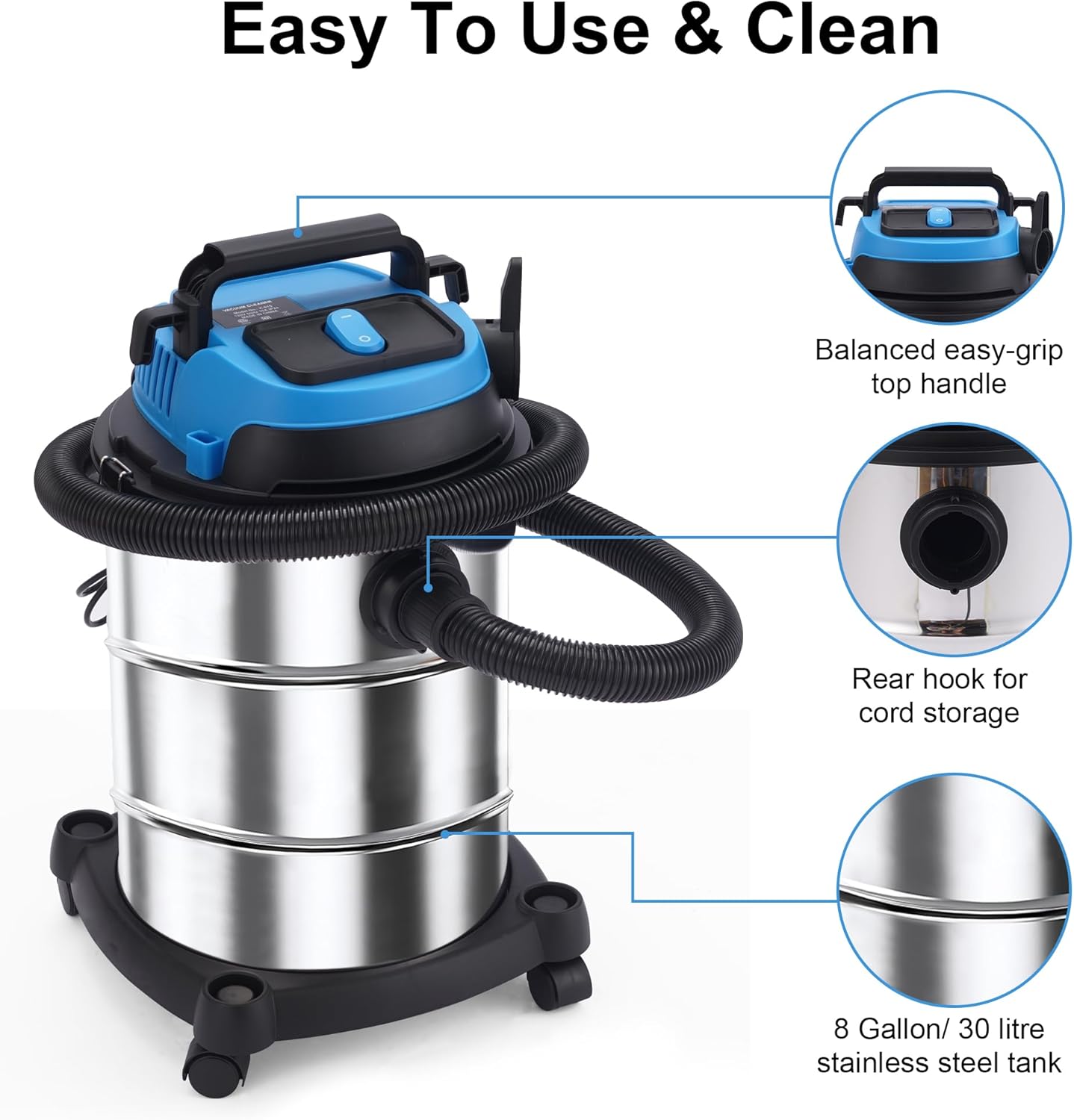 Large Capacity- This vacuum cleaner for home has a Larger capacity of 8-gallon 30 litre SS tank.You don’t have to empty the collection tank frequently anymore, which streamlines the process of cleaning, making it more effortless.