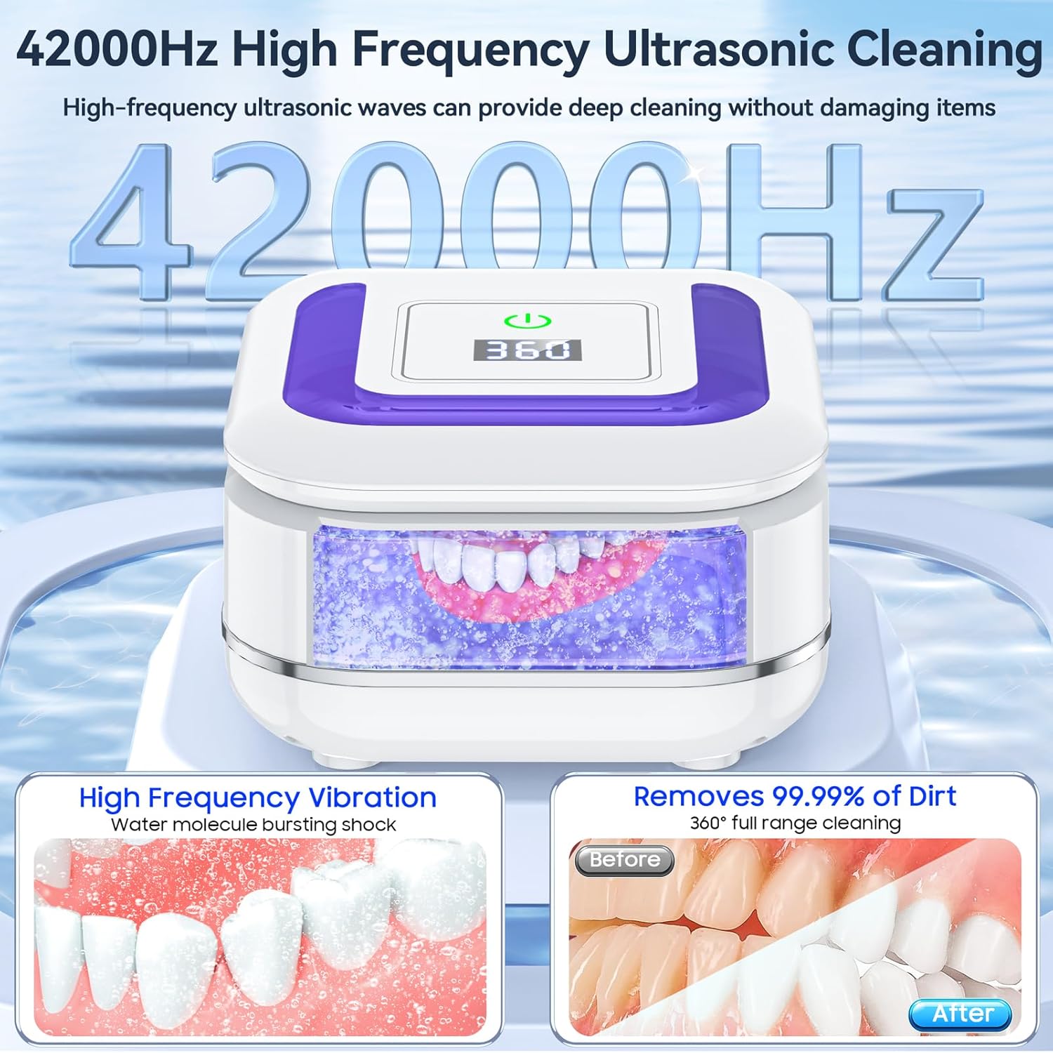 Ultrasonic Deep Cleaning Retainer: Featuring 42,000Hz ultrasonic technology, our 24W retainer cleaner produces millions of micro-bubbles for a 360° all-around deep cleaning. It effectively removes dirt and stain from dental appliances and jewelry without damage, ensuring a gentle yet thorough refresh.