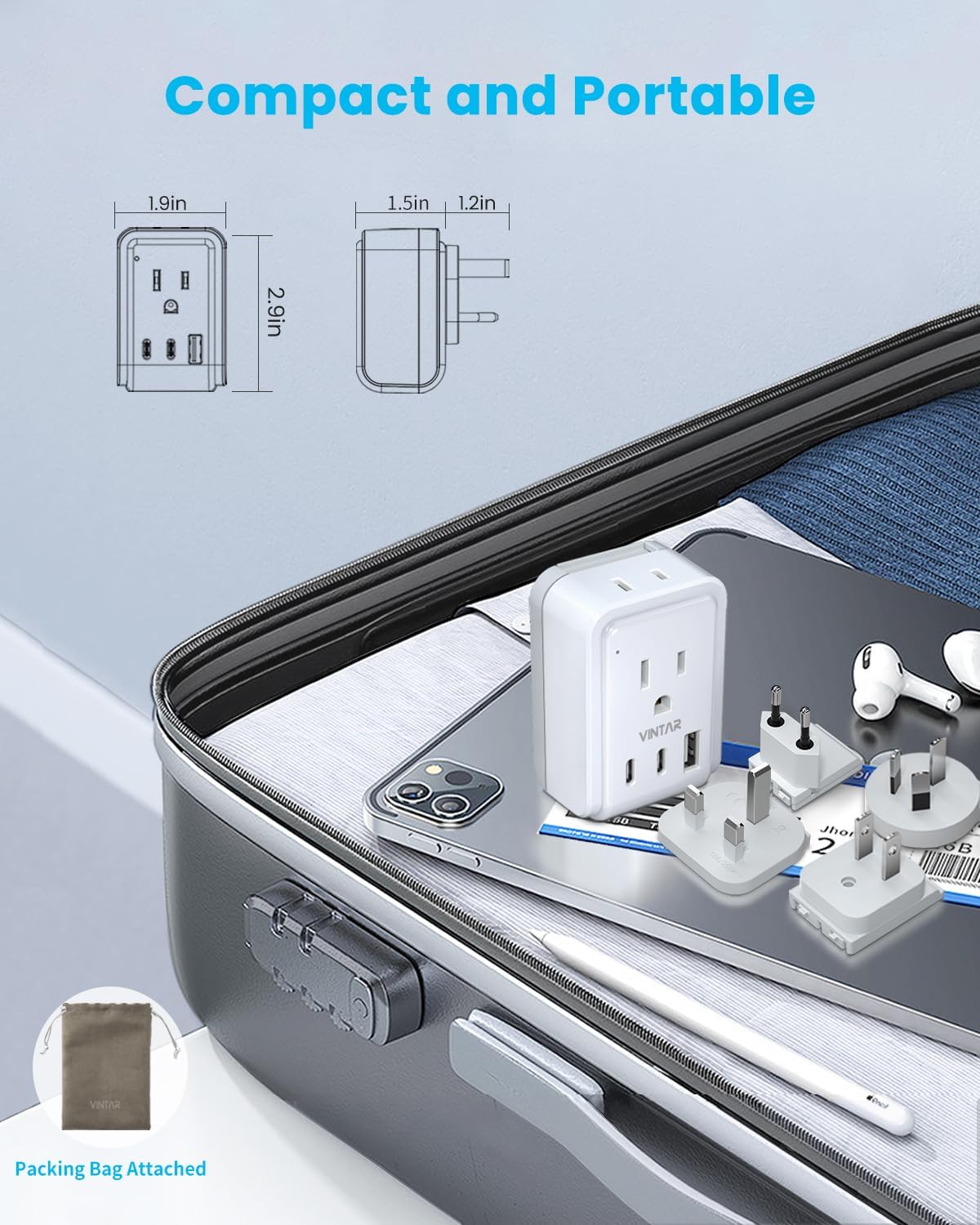 [Light and Compact] This compact universal plug adapter for worldwide travel can save your suitcase space(Dimensions: 3.0×2.0x1.8in. without plug attached). Included storage bag to prevent plug breaking and equipment bumping during the journey. Easy to use, the Led indicator can let you know the power is on/off. Outlet converter will be your travel essentials during world trips and cruise trip.