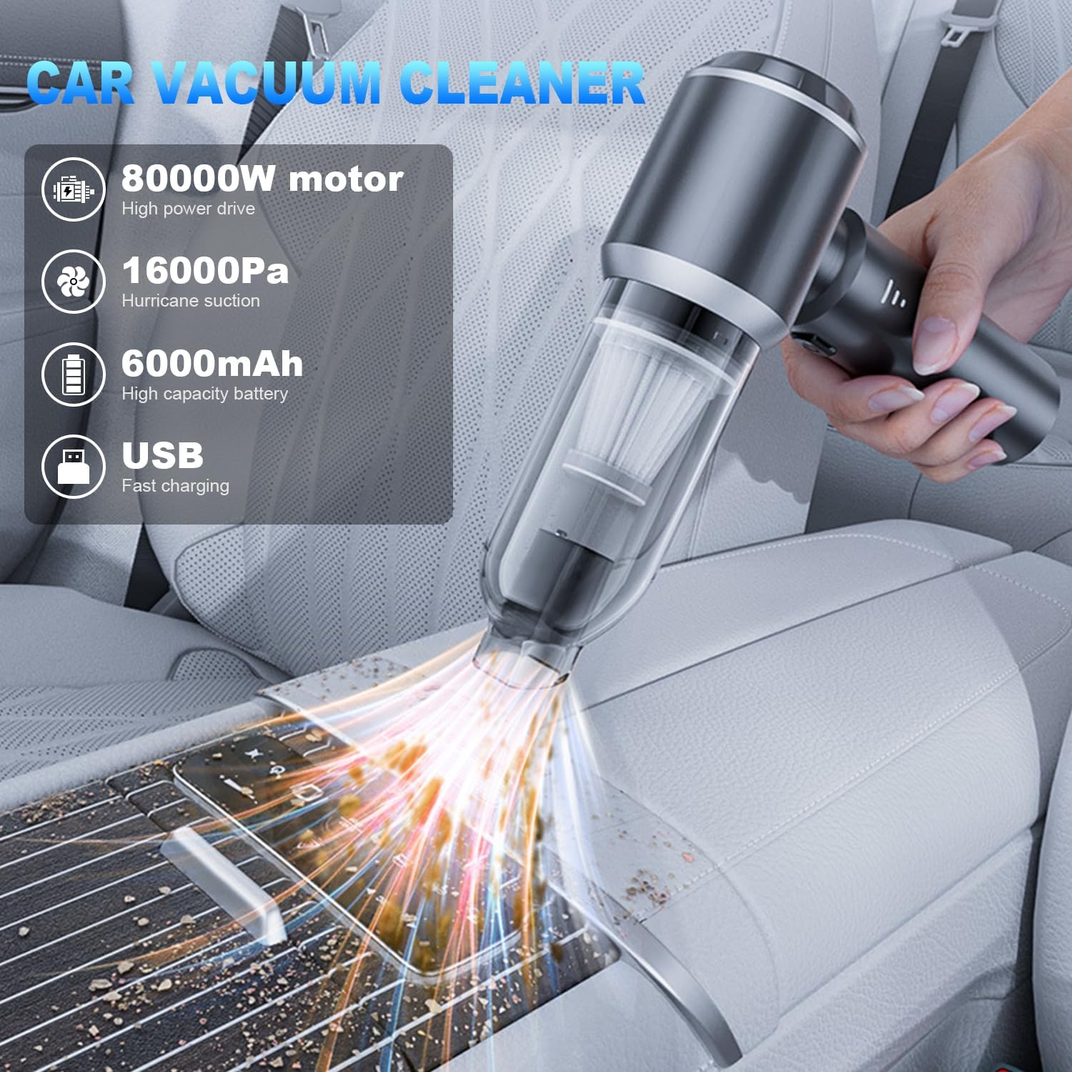 Super Suction Power Vacuum:High-speed brushless motor provides strong suction of 16000Pa to quickly and effortlessly picks up sand, debris, ofa crevices from dust or snacks dropped in the car.