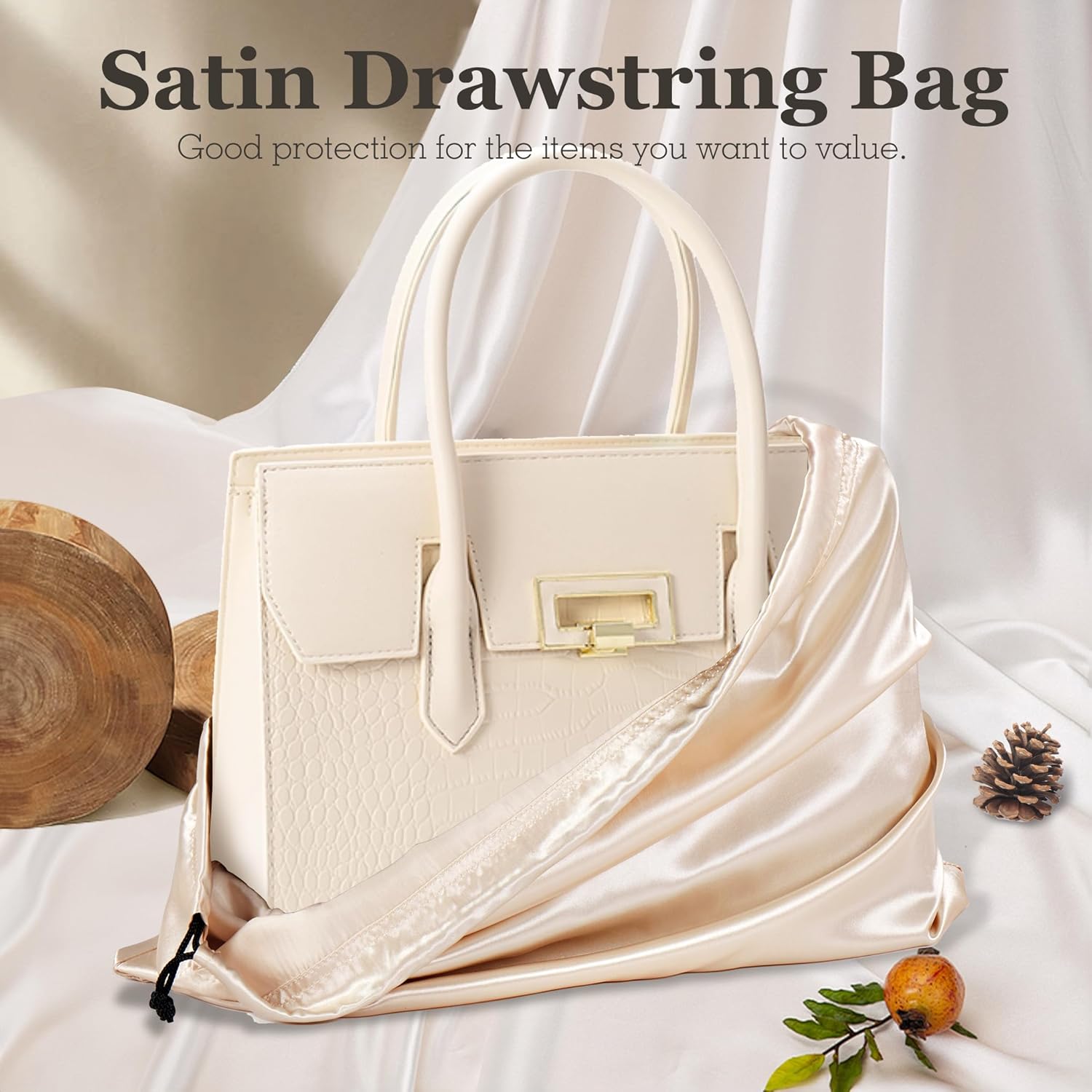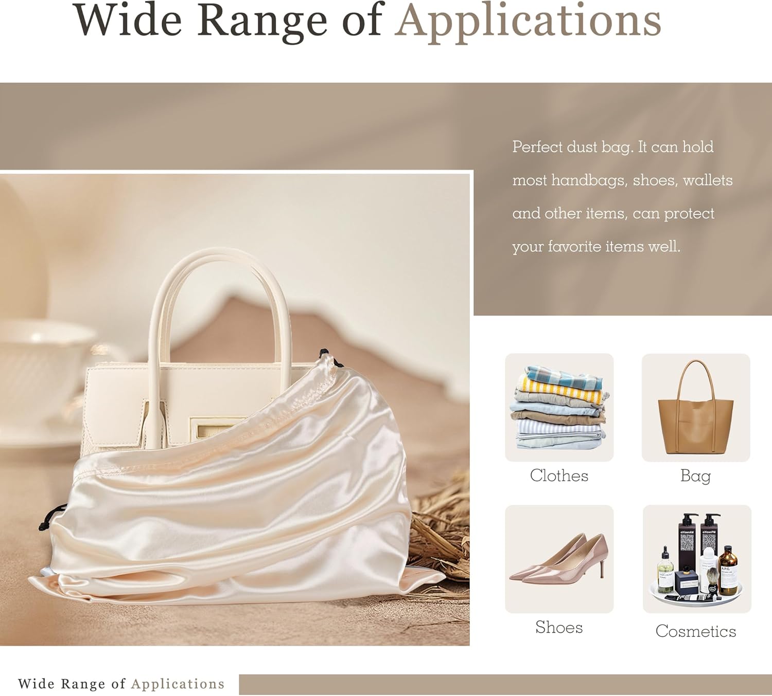 POWERFUL UTILITY: This set includes 3 drawstring dust bags measuring 15.7 x 19.6 inch (40x50cm). The satin bags are big enough to hold a wide variety of items for a variety of luxury items such as handbags, shoes and accessories. They are foldable for easy carrying, long-lasting and reusable, and ensure complete protection of your belongings.
