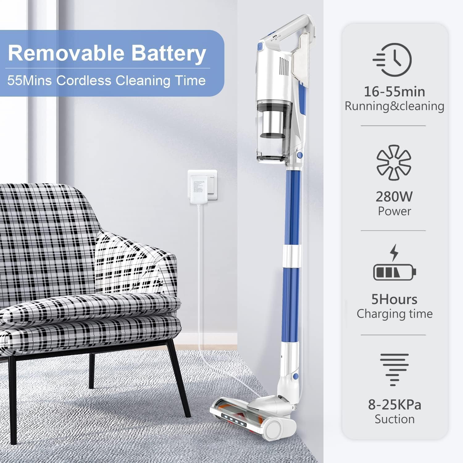 【8-CELL BATTERY FOR LONG RUNTIME】The cordless vacuum cleaner with a large-capacity battery provides up to 55 mins of daily cleaning in the standard mode, the running time is more longer, and MAX mode provides 16 mins of deep cleaning. It can be charged on the wall mount to save storage space.