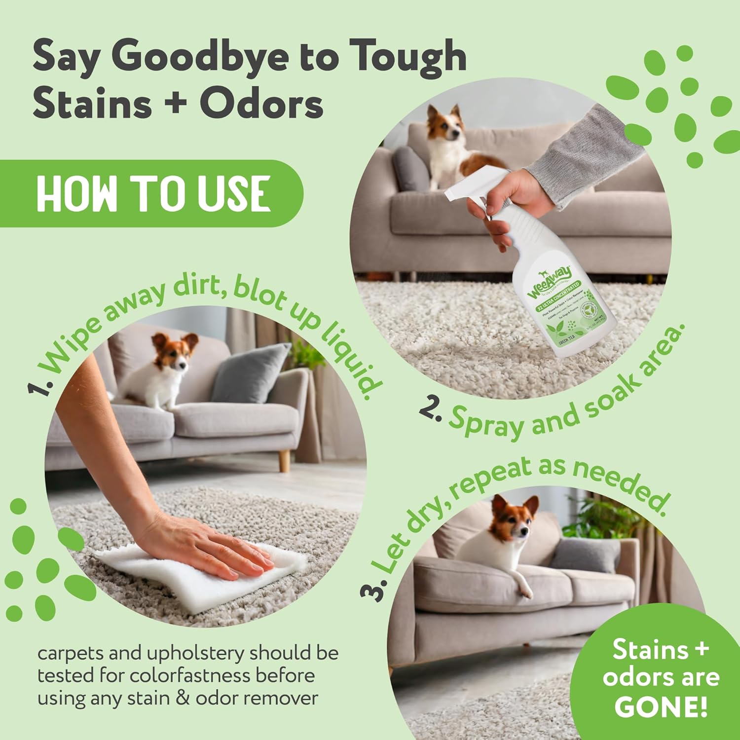 REDUCE STRESS, SAVE TIME. Easy to use urine destroyer for dogs. Simply wipe away dirt and blot up liquid, apply Wee Away stain remover spray and soak the area. Let dry and repeat as needed.